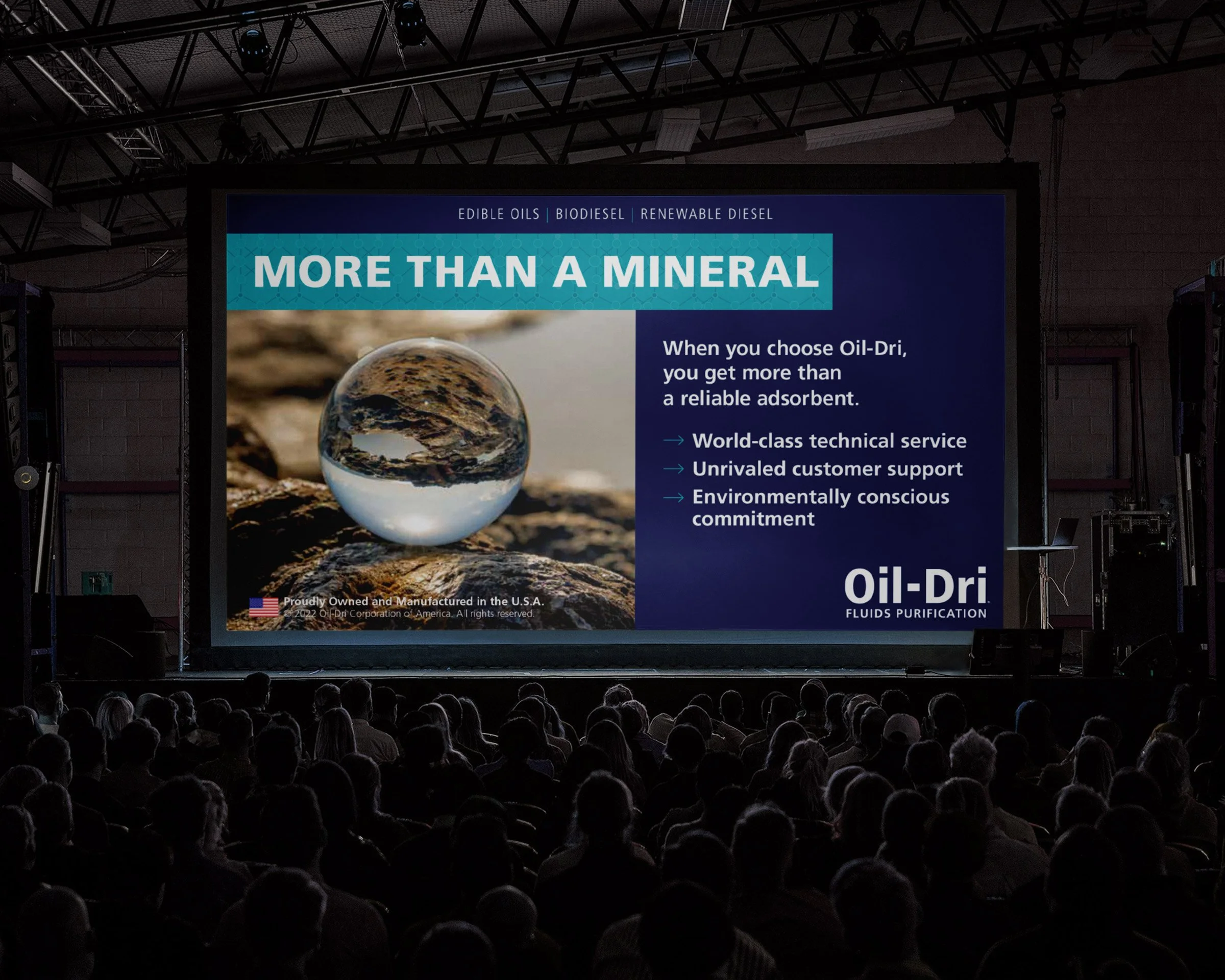 We developed a unified, high-level advertisement for the edible oils, biodiesel, and renewable diesel markets centered on a single, striking visual: a clear magnifying marble resting on a bed of stone, symbolizing the natural essence of Oil-Dri’s adsorbent mineral products. By anchoring their product in a symbol of clarity and depth, we positioned Oil-Dri as more than a vendor—they are a trusted partner with dependable market expertise.